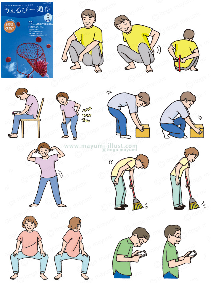 「うぇるびー通信さま 9月号」にてストレッチのイラストを作成いたしました。